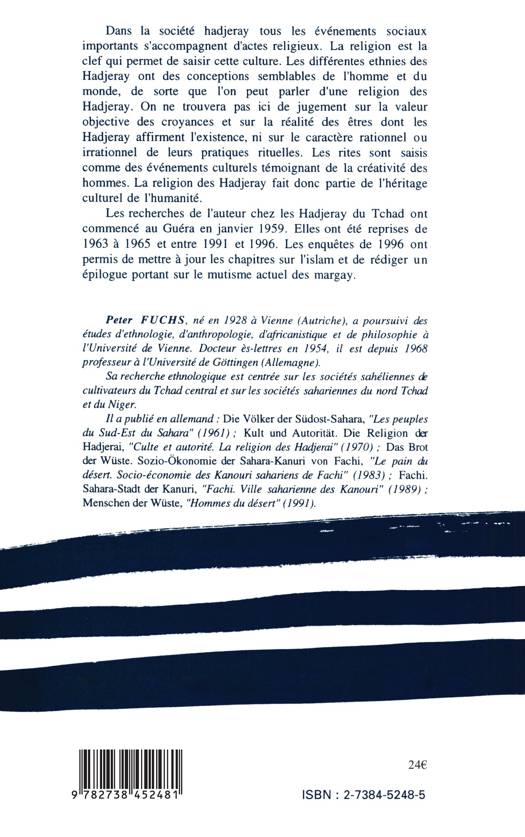Dans la société hadjeray tous les événements sociaux importants s'accompagnent d'actes religieux. La religion est la clef qui permet de saisir cette culture. Les différentes ethnies des Hadjeray ont des conceptions semblables. de l'homme et du monde, de sorte que l'on peut parler d'une religion des Hadjeray. On ne trouvera pas ici de jugement sur la valeur objective des croyances et sur la réalité des êtres dont les Hadjeray affirment l'existence, ni sur le caractère rationnel ou irrationnel de leurs pratiques rituelles. Les rites sont saisis comme des événements culturels témoignant de la créativité des hommes. La religion des Hadjeray fait donc partie de l'héritage culturel de l'humanité.