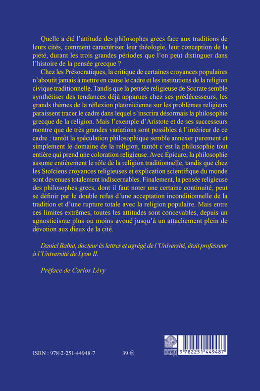 Quelle a ete l'attitude des philosophes grecs face aux traditions de leurs cites, comment caracteriser leur theologie, leur conception de la piete, durant les trois grandes periodes que l'on peut distinguer dans l'histoire de la pensee grecque ? Chez les Presocratiques, la critique de certaines croyances populaires n'aboutit jamais a mettre en cause le cadre et les institutions de la religion civique traditionnelle. Tandis que la pensee religieuse de Socrate semble synthetiser des tendances deja apparues chez ses predecesseurs, les grands themes de la reflexion platonicienne sur les problemes religieux paraissent tracer le cadre dans lequel s'inscrira desormais la philosophie grecque de la religion. Mais l'exemple d'Aristote et de ses successeurs montre que de tres grandes variations sont possibles a l'interieur de ce cadre: tantot la speculation philosophique semble annexer purement et simplement le domaine de la religion, tantot c'est la philosophie tout entiere qui prend une coloration religieuse. Avec Epicure, la philosophie assume entierement le role de la religion traditionnelle, tandis que chez les Stoiciens croyances religieuses et explication scientifique du monde sont devenues totalement indiscernables. Finalement, la pensee religieuse des philosophes grecs, dont il faut noter une certaine continuite, peut se definir par le double refus d'une acceptation inconditionnelle de la tradition et d'une rupture totale avec la religion populaire. Mais entre ces limites extremes, toutes les attitudes sont concevables, depuis un agnosticisme plus ou moins avoue jusqu'a un attachement plein de devotion aux dieux de la cite.