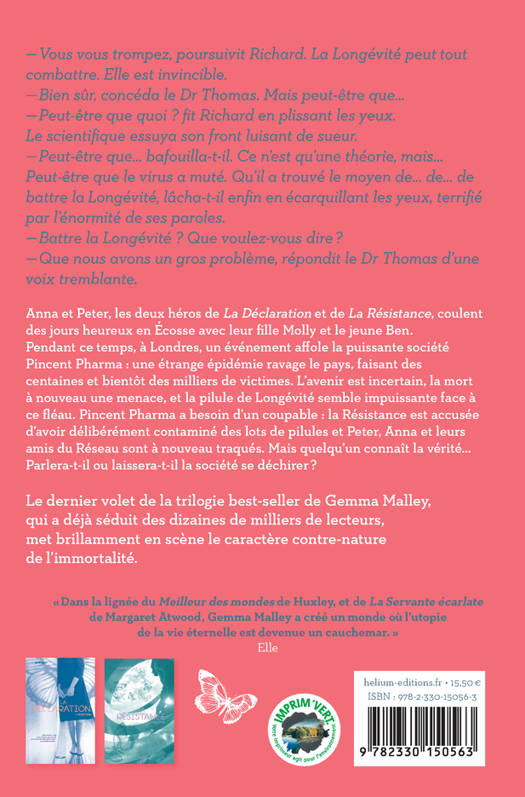 Tandis qu'Anna et Peter coulent des jours tranquilles en Écosse avec leur fille Molly, une étrange épidémie provoque la mort de milliers d'individus et affole la puissante société Pincent Pharma. Et si l'immortalité n'était qu'une utopie ? Le dernier volet de la trilogie best-seller de Gemma Malley, une dystopie haletante sur le pouvoir de la science et la peur de la mort, qui a déjà séduit des dizaines de milliers de lecteurs.