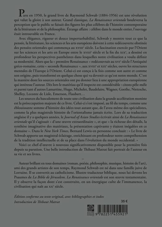 Les sources du basculement de toute une civilisation dans la grande accélération moniste est la préoccupation majeure de ce livre. Celui-ci s’est imposé, au fil du temps, comme une éblouissante somme d’histoire des idées tout autant que, de l’aveu même des spécialistes, comme la plus magistrale histoire de l’orientalisme jamais écrite. Lors de sa traduction anglaise il y a quelques années, le Journal of Asian Studies écrivait ainsi de La Renaissance orientale qu’il s’agissait « d’une oeuvre extraordinaire », et que « la richesse des détails, la synthèse imaginative des matériaux, la présentation captivante y étaient inégalées en ce domaine ». Dans le New York Times, Bernard Lewis en personne concluait : « Le livre de Schwab apporte un magistral éclairage, enrichissant en profondeur notre compréhension de la tradition intellectuelle et de sa place dans l’évolution du monde occidental. »