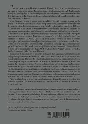 Paru en 1950, le grand livre de Raymond Schwab (1884-1956) est une révolution qui valut la gloire à son auteur. Grand classique, La Renaissance orientale bouleversa la perception que le public se faisait des figures les plus célèbres de l’histoire contemporaine de la littérature et de la philosophie. Étrange affaire : célèbre dans le monde entier, l’ouvrage était introuvable en France.