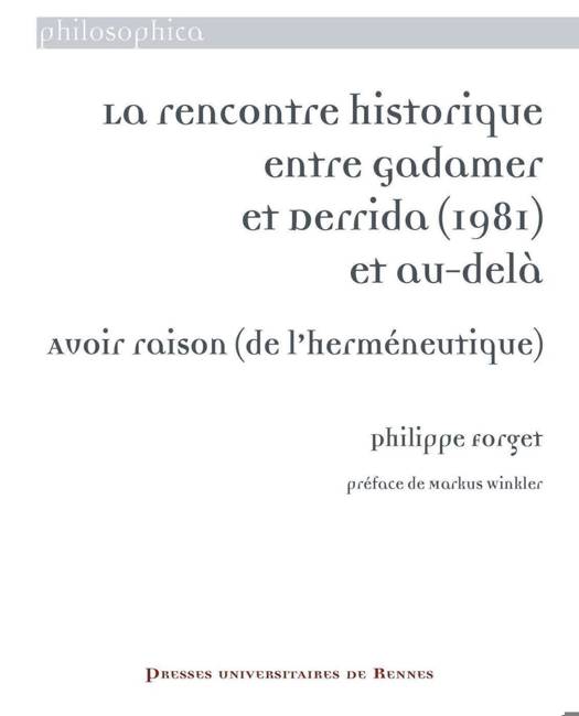 En avril 1981, Philippe Forget organisait à l'Institut Goethe de Paris une rencontre qui donnait à Hans-Georg Gadamer et Jacques Derrida l'occasion de faire connaissance. Ce livre est d'abord le récit détaillé, fondé sur les archives entièrement inédites conservées par l'auteur, de la préparation, du déroulement et des suites de ces échanges. Il compare ensuite la manière dont Gadamer et Derrida lisent respectivement Mörike et Baudelaire, et tous deux Celan, pour montrer que leur rencontre fut bel et bien « historique », puisqu'elle n'engage pas moins que notre « tradition philosophique dans son ensemble ». la philosophie contemporaine du langage.