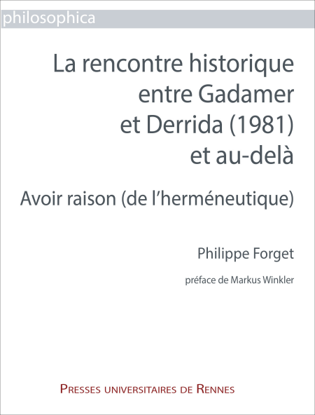 En avril 1981, Philippe Forget organisait à l’Institut Goethe de Paris une rencontre qui donnait à Hans-Georg Gadamer et Jacques Derrida l’occasion de faire connaissance. Ce livre est d’abord le récit détaillé, fondé sur les archives entièrement inédites conservées par l’auteur, de la préparation, du déroulement et des suites de ces échanges. Il compare ensuite la manière dont Gadamer et Derrida lisent respectivement Mörike et Baudelaire, et tous deux Celan, pour montrer que leur rencontre fut bel et bien « historique », puisqu’elle n’engage pas moins que notre « tradition philosophique dans son ensemble ».L’ouvrage constitue donc une intervention profondément originale dans le champ de la philosophie contemporaine puisqu’il rouvre sur de toutes nouvelles bases le problème des rapports entre herméneutique et déconstruction, et tout indique qu’il est appelé à faire référence sur cette question. Il ne manquera pas de s’imposer comme un texte de premier plan dans les débats portant sur les rapports entre littérature et philosophie, sans parler de la contribution qu’il apporte à tout un pan de la philosophie contemporaine du langage.