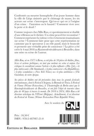 Confrontés au meurtre homophobe d’un jeune homme dans la ville de Liège sinistrée par le chômage de masse, les six acteurs sur scène s’interrogent. Qu'est-ce qui est à l'origine d'un crime – l'intention ou le hasard ? Comment vivre avec la perte et le deuil ? Comme toujours chez Milo Rau, ce questionnement se double d’une réflexion sur le théâtre. Un crime peut-il être reconstitué ? Comment représenter la violence et les évènements traumatisants sur scène ? Comment faire pour que cette représentation ne cantonne pas le spectateur à un rôle passif, mais le bouscule et permette une véritable prise de conscience ? La pièce a été créée le 4 mai 2018 au Kunstenfestivaldesarts à Bruxelles, dans une mise en scène de l’auteur.