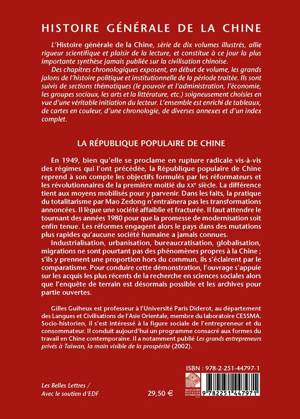 HISTOIRE GENERALE DE LA CHINE L'Histoire generale de la Chine, serie de dix volumes illustres, allie rigueur scientifique et plaisir de la lecture, et constitue a ce jour la plus importante synthese jamais publiee sur la civilisation chinoise. Des chapitres chronologiques exposent, en debut de volume, les grands jalons de l'histoire politique et institutionnelle de la periode traitee. Ils sont suivis de sections thematiques (administration, vie quotidienne, religion, litterature, economie, etc.) soigneusement choisies en vue d'une veritable initiation du lecteur. L'ensemble est enrichi de nombreuses illustrations, de cartes en couleur, d'une chronologie, de diverses annexes et d'un index complet. LA REPUBLIQUE POPULAIRE DE CHINE En 1949, bien qu'elle se proclame en rupture radicale vis-a-vis des regimes qui l'ont precedee, la Republique populaire de Chine reprend a son compte les objectifs formules par les reformateurs et les revolutionnaires de la premiere moitie du XXe siecle. La difference tient aux moyens mobilises pour y parvenir. Dans les faits, la pratique du totalitarisme par Mao Zedong n'entrainera pas les transformations annoncees. Il legue une societe affaiblie et fracturee. Il faut attendre le tournant des annees 1980 pour que la promesse de modernisation soit enfin tenue. Les reformes engagent alors le pays dans des mutations plus rapides qu'aucune societe humaine n'en a jamais connues. Industrialisation, urbanisation, bureaucratisation, globalisation, migrations ne sont pourtant pas des phenomenes propres a la Chine; s'ils y prennent une proportion hors du commun, ils s'eclairent par le comparatisme. Pour conduire cette demonstration, l'ouvrage s'appuie sur les acquis les plus recents de la recherche en sciences sociales alors que l'enquete de terrain est desormais possible et les archives pour partie ouvertes.