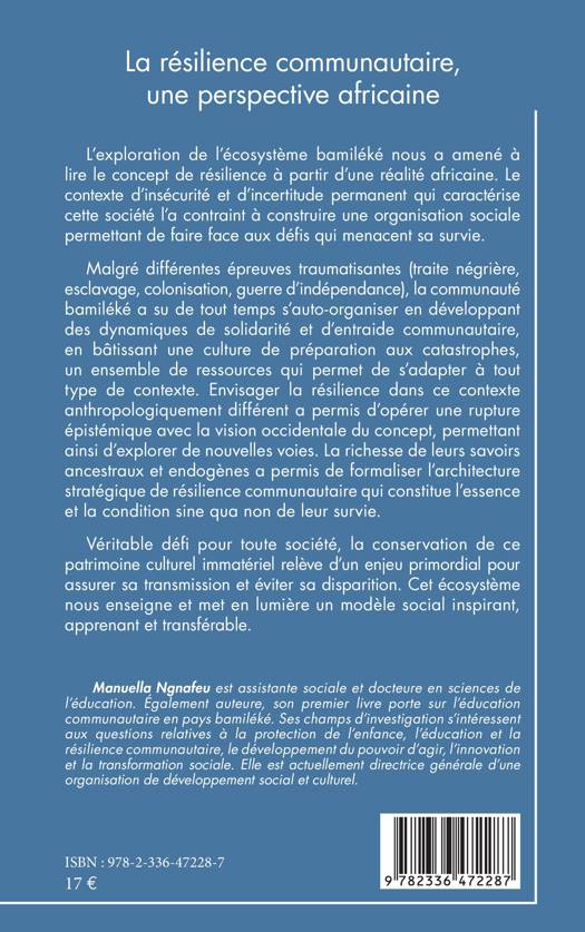 L'exploration de l'écosystème bamiléké nous a amené à lire le concept de résilience à partir d'une réalité africaine. Le contexte d'insécurité et d'incertitude permanent qui caractérise cette société l'a contraint à construire une organisation sociale permettant de faire face aux défis qui menacent sa survie. Malgré différentes épreuves traumatisantes (traite négrière, esclavage, colonisation, guerre d'indépendance), la communauté bamiléké a su de tout temps s'auto-organiser en développant des dynamiques de solidarité et d'entraide communautaire, en bâtissant une culture de préparation aux catastrophes, un ensemble de ressources qui permet de s'adapter à tout type de contexte. La richesse de leurs savoirs ancestraux et endogènes a permis de formaliser l'architecture stratégique de résilience communautaire qui constitue l'essence et la condition sine qua none de leur survie. Véritable défi pour toute société, la conservation de ce patrimoine culturel immatériel relève d'un enjeu primordial pour assurer sa transmission et éviter sa disparition. Cet écosystème nous enseigne et met en lumière un modèle social inspirant, apprenant et transférable.