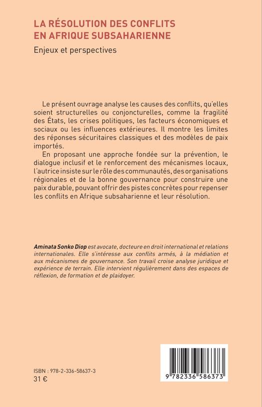 Le présent ouvrage analyse les causes des conflits, qu'elles soient structurelles ou conjoncturelles, comme la fragilité des États, les crises politiques, les facteurs économiques et sociaux ou les influences extérieures. Il montre les limites des réponses sécuritaires classiques et des modèles de paix importés. En proposant une approche fondée sur la prévention, le dialogue inclusif et le renforcement des mécanismes locaux, l'autrice insiste sur le rôle des communautés, des organisations régionales et de la bonne gouvernance pour construire une paix durable, pouvant offrir des pistes concrètes pour repenser les conflits en Afrique subsaharienne et leur résolution.