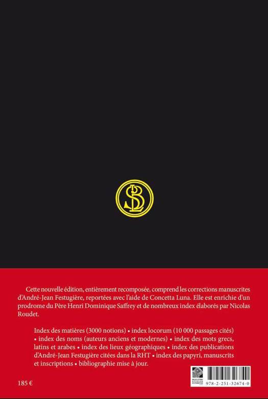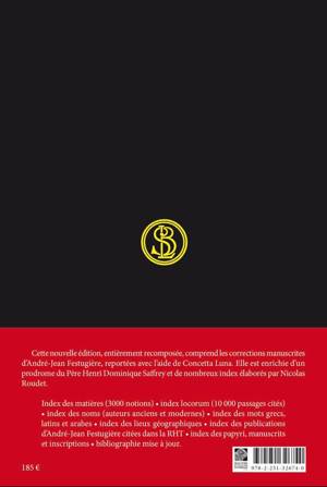 Index des matières (3000 notions) • index locorum (10 000 passages cités) • index des noms • index des mots grecs, latins et arabes • index des lieux géographiques • index des auteurs anciens et modernes • index des publications d’André-Jean Festugière citées dans la RHT • index des manuscrits (textes bibliques, inscriptions et papyri) • bibliographie mise à jour.
