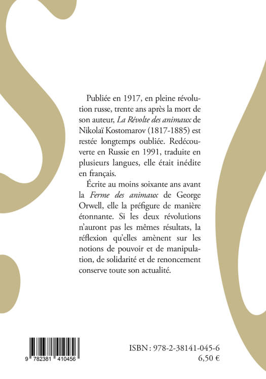 Publiée en 1917, en pleine révolution russe, trente ans après la mort de son auteur, La Révolte des animaux de Nikolaï Kostomarov (1817-1885) est restée longtemps oubliée. Redécouverte en Russie en 1991, traduite en plusieurs langues, elle était inédite en français.