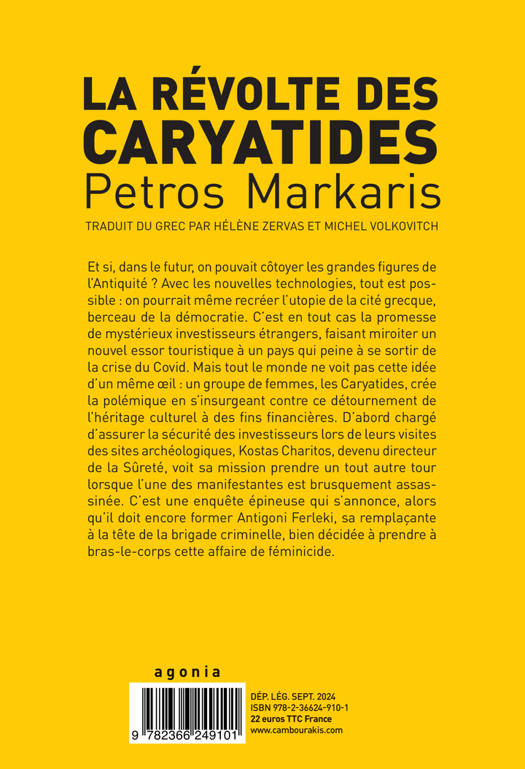 Et si, dans le futur, on pouvait côtoyer les grandes figures de l'Antiquité ? Avec les nouvelles technologies, tout est possible : on pourrait même recréer l'utopie de la cité grecque, berceau de la démocratie. C'est en tout cas la promesse de mystérieux investisseurs étrangers, faisant miroiter un nouvel essor touristique à un pays qui peine à se sortir de la crise du Covid. Mais tout le monde ne voit pas cette idée d'un même oeil : un groupe de femmes, les Caryatides, crée la polémique en s'insurgeant contre ce détournement de l'héritage culturel à des fins financières. D'abord chargé d'assurer la sécurité des investisseurs lors de leurs visites des sites archéologiques, Kostas Charitos, devenu directeur de la Sûreté, voit sa mission prendre un tout autre tour lorsque l'une des manifestantes est brusquement assassinée. C'est une enquête épineuse qui s'annonce, alors qu'il doit encore former Antigoni Ferleki, sa remplaçante à la tête de la brigade criminelle, bien décidée à prendre à bras-le-corps cette affaire de féminicide.