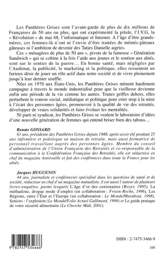 Les Panthères Grises sont l'avant-garde de plus de dix millions de Françaises de 50 ans ou plus, qui ont expérimenté la pilule, l'I.V.G., la « Révolution » de mai 68, l'informatique et Internet. Ces « ménagères de plus de 50 ans », qui se coltinent à la fois l'aide aux jeunes et le soutien aux aînés, sont sur le sentier de la guerre…En bonne santé, mais négligées par l'Audimat, la publicité, le marketing et la politique, elles ressentent un furieux désir de jouer un rôle actif dans notre société et de vivre pleinement jusqu'à leur dernier souffle. Ni parti ni syndicat, les Panthères Grises se veulent le laboratoire d'idées d'une nouvelle génération de femmes qui entend briser des tabous…