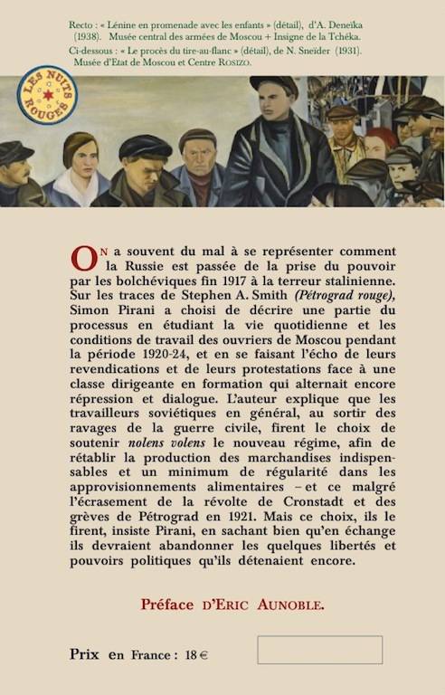 On a souvent du mal à se représenter comment la Russie est passée de la prise du pouvoir par les bolchéviques fin 1917 à la terreur stalinienne. Simon Pirani a choisi de décrire une partie du processus en étudiant la vie quotidienne et les conditions de travail des ouvriers de Moscou pendant la période 1920-24, et en se faisant l'écho de leurs revendications et de leurs protestations face à une classe dirigeante en formation qui alternait encore répression et dialogue. L'auteur explique que les travailleurs en général, au sortir des ravages de la guerre civile, firent le choix de soutenir le nouveau régime, afin de rétablir les productions indispensables et un minimum de régularité dans les approvisionnements alimentaires et ce malgré l'écrasement de la révolte de Cronstadt et des grèves de Pétrograd en 1921. Mais ce choix, ils le firent, insiste Pirani, en sachant bien qu'en échange ils devraient abandonner les quelques libertés et pouvoirs politiques qu'ils détenaient encore.