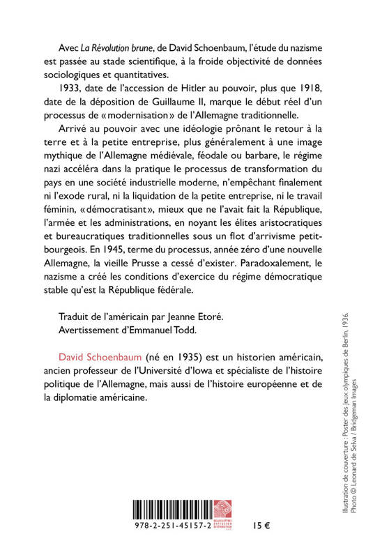 Avec La Revolution brune, de David Schoenbaum, l'etude du nazisme est passee au stade scientifique, a la froide objectivite de donnees sociologiques et quantitatives.1933, date de l'accession de Hitler au pouvoir, plus que 1918, date de la deposition de Guillaume II, marque le debut reel d'un processus de modernisation de l'Allemagne traditionnelle. Arrive au pouvoir avec une ideologie pronant le retour a la terre et a la petite entreprise, plus generalement a une image mythique de l'Allemagne medievale, feodale ou barbare, le regime nazi accelera dans la pratique le processus de transformation du pays en une societe industrielle moderne, n'empechant finalement ni l'exode rural, ni la liquidation de la petite entreprise, ni le travail feminin, democratisant , mieux que ne l'avait fait la Republique, l'armee et les administrations, en noyant les elites aristocratiques et bureaucratiques traditionnelles sous un flot d'arrivisme petit-bourgeois. En 1945, terme du processus, annee zero d'une nouvelle Allemagne, la vieille Prusse a cesse d'exister. Paradoxalement, le nazisme a cree les conditions d'exercice du regime democratique stable qu'est la Republique federale.