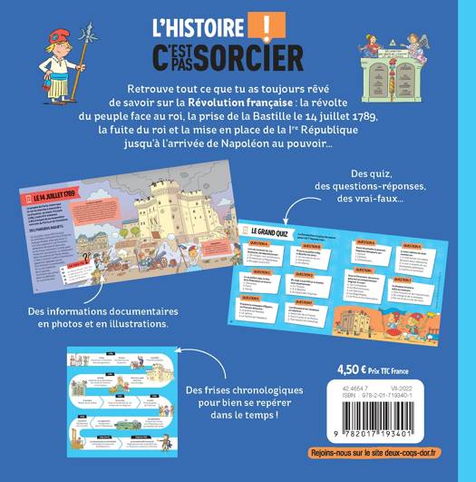 Un mix d'informations, de quiz, de chiffres clés, de photos et d'illustrations sur la Révolution française. Les événements-clés de cette période de l'Histoire de France : la révolte du peuple devant les fastes de la royauté, la prise de la Bastille, la chute de la monarchie et l'instauration de la République, de la convocation des États généraux à l'arrivée de Napoléon au pouvoir. Avec une frise chronologique pour aider l'enfant à se repérer dans le temps.
