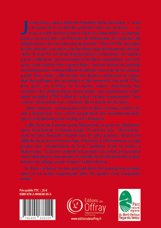 Jacques Galas, qui se défend d’emblée d’être historien — mais a le goût de la recherche patiente dans les archives — et nous avertit qu’il ne pourra taire ses sympathies, a exploré, pour ce nouvel opus sur l’histoire de Malaucène, les registres de délibérations du conseil municipal entre 1760 et 1799, ainsi que les documents conservés aux Archives départementales de Vaucluse. Il nous les restitue dépoussiérés, commentés, et animés par les réflexions que lui inspirent lesdites sympathies. Les réunions sont parfois très rapprochées, surtout durant la période révolutionnaire, et fourmillent de détails sur la vie de la communauté. En octobre 1792, disparition des registres des délibérations municipales, qui reprennent seulement en juillet 1794. Fallait-il cacher certains événements ? Les sources disponibles ne comblent qu’en partie les lacunes… Autre surprise : si l’émigration des nobles est bien connue, il y eut à Malaucène une courte émigration des révolutionnaires, qui se réfugièrent pour la plupart à Avignon. L’affection de l’auteur pour Malaucène et pour les Malaucéniens transparaît à chaque page, et surtout son « obsession » pour les plus humbles d’entre eux, les plus pauvres, dont il est difficile de trouver la trace dans l’histoire. La Révolution a-t-elle permis une amélioration de leur condition, tout au moins à Malaucène ? L’ancien statisticien prend ici le relais pour tenter une estimation économique et sociale de la situation des populations du village avant et après la Révolution.