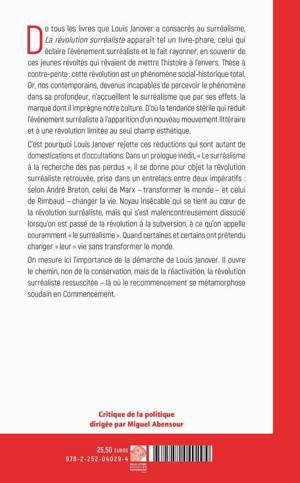C'est pourquoi Louis Janover rejette ces réductions qui sont autant de domestications et d'occultations. Dans un prologue inédit, « Le surréalisme à la recherche des pas perdus », il se donne pour objet la révolution surréaliste retrouvée, prise dans un entrelacs entre deux impératifs : selon André Breton, celui de Marx — transformer le monde — et celui de Rimbaud — changer la vie. Noyau insécable qui se tient au cœur de la révolution surréaliste, mais qui s'est malencontreusement dissocié lorsqu'on est passé de la révolution à la subversion, à ce qu'on appelle couramment « le surréalisme ». Quand certaines et certains ont prétendu changer « leur » vie sans transformer le monde.