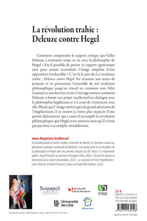 Comment comprendre le rapport critique que Gilles Deleuze a entretenu toute sa vie avec la philosophie de Hegel ? Est-il possible de penser ce rapport agonistique sans pour autant reconduire l’image simpliste d’une opposition irréductible ? C’est là le pari de La révolution trahie : Deleuze contre Hegel. En revenant aux textes de jeunesse et en parcourant l’ensemble de son évolution philosophique jusqu’au travail en commun avec Félix Guattari et aux derniers écrits, l’ouvrage montre comment Deleuze a formé son projet intellectuel en dialogue avec la philosophie hégélienne et n’a cessé de s’entretenir avec elle. Plutôt que l’image stéréotypée du grand adversaire de l’hégélianisme, il en ressort la vision plus nuancée d’une pensée deleuzienne qui a tenté d’accomplir la révolution philosophique que Hegel avait amorcée mais qu’il n’était pas parvenu à accomplir véritablement.