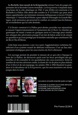La Rochelle, base navale de la Kriegsmarine retrace l’une des pages importantes de la Seconde Guerre mondiale. La Kriegsmarine s’implante dans cinq bases de la côte atlantique en 1941. L’une d’elles est construite à La Rochelle-La Pallice. Elle abrite dès octobre la 3e U-Flottille qui peut ainsi mieux appréhender ses lointaines missions belliqueuses à travers l’Océan Atlantique. L’Amiral Karl Dönitz a pour objectif d’étrangler la Grande-Bretagne, seule puissance qui poursuit le combat, en coulant tous les bateaux de ravitaillement qui lui sont destinés. L’U-Bunker construit à La Pallice peut abriter, procéder aux réparations et assurer l’approvisionnement et l’armement des U-Boote. Le chantier gigantesque est mené à terme en quelques mois et l’ouvrage peut résister aux attaques des adversaires puisqu’il est fait de béton armé et de ciment en quantité et qu’il est protégé par la barrière naturelle que constituent l’île de Ré et l’île d’Oléron. Cette base sous-marine a une vie à part, l’agglomération rochelaise bénéficiant d’un système massif de défenses extérieures. C’est un lieu éminemment stratégique pour les sous-marins du Reich allemand. Cet ouvrage permet de prendre la mesure de ce qu’a été à l’époque la base de La Pallice, de découvrir quels sont les lieux privilégiés des patrouilles et de connaître la vie quotidienne des sous-mariniers. Entre le nombre de navires adverses coulés, la durée de vie de plus en plus réduite d’un U-Boot et de son équipage, les années 1941 à 1944 illustrent la grandeur et la décadence de la Kriegsmarine, que les sous-mariniers ont servie jusque dans la mort.