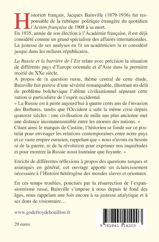 La Russie et la barrière de l'Est relate avec précision la situation de différents pays d'Europe orientale et d'Asie dans la première moitié du XXe siècle. A propos de la question russe, thème central de cette étude, Bainville fait preuve d'une sévérité remarquable, illustrant au-delà du problème bolchevique l'abîme civilisationnel séparant cette nation si particulière de l'esprit occidental. «La Russie est à peine aujourd'hui à quatre cents ans de l'invasion des Barbares, tandis que l'Occident a subi la même crise depuis quatorze siècles : une civilisation de mille ans plus ancienne met une distance incommensurable entre les moeurs des nations. » Citant ainsi le marquis de Custine, l'historien se fonde sur ce postulat pour envisager les relations contemporaines entre notre pays et ce vaste empire eurasien, rappelant que « nous n'avons eu besoin ni de la guerre, ni de la révolution pour exprimer nos inquiétudes et pour montrer la Russie aussi lointaine que fuyante. » Enrichi de différentes réflexions à propos des questions turques et asiatiques en général, cet ouvrage apporte un éclaircissement nécessaire à l'Histoire hétérogène des mondes slaves et orientaux. En ces temps troubles, ponctués par la résurrection de l'expansionnisme russe, Bainville s'impose à nous depuis le fond des âges, nous rappelant une fois encore à sa justesse analytique et à ses dons de visionnaire.