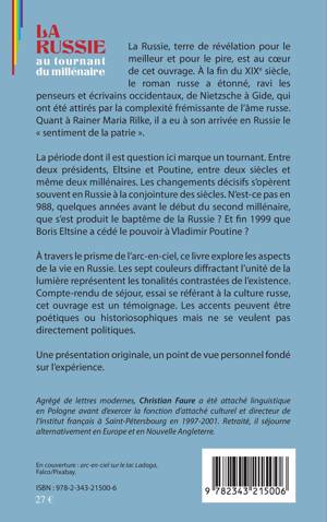 À travers le prisme de l'arc-en-ciel, ce livre explore les aspects de la vie en Russie. La période dont il est question ici marque un tournant. Entre deux présidents, Eltsine et Poutine, entre deux siècles et même deux millénaires. Les changements décisifs s'opèrent souvent en Russie à la conjointure des siècles. Compte-rendu de séjour, essai se référant à la culture russe, cet ouvrage est un témoignage original, un point de vue personnel fondé sur l'expérience.