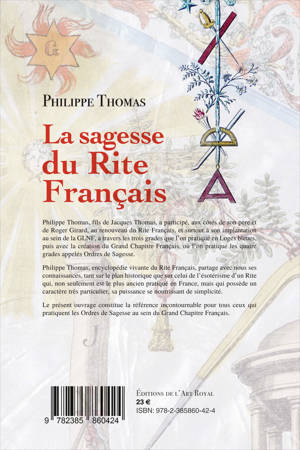 Philippe Thomas, fils de Jacques Thomas, a participé, aux côtés de son père et de Roger Girard, au renouveau du Rite Français, et surtout à son implantation au sein de la GLNF, à travers les trois grades que l’on pratique en Loges bleues, puis avec la création du Grand Chapitre Français, où l’on pratique les quatre grades appelés Ordres de Sagesse. Philippe Thomas, encyclopédie vivante du Rite Français, partage avec nous ses connaissances, tant sur le plan historique que sur celui de l’ésotérisme d’un Rite qui, non seulement est le plus ancien pratiqué en France, mais qui possède un caractère très particulier, sa puissance se nourrissant de simplicité. Le présent ouvrage constitue la référence incontournable pour tous ceux qui pratiquent les Ordres de Sagesse au sein du Grand Chapitre Français.