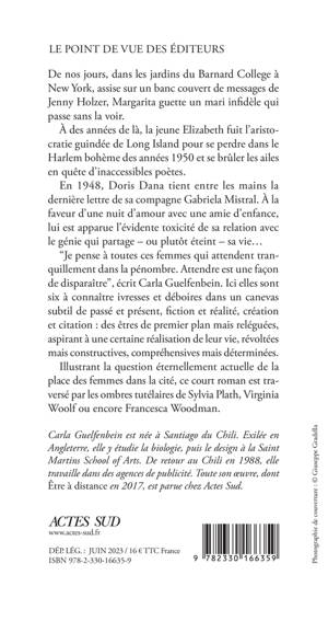 De nos jours, dans les jardins du Barnard College à New York, assise sur un banc couvert de messages de Jenny Holzer, Margarita guette un mari infidèle qui passe sans la voir. À des années de là, la jeune Elizabeth fuit l'aristocratie guindée de Long Island pour se perdre dans le Harlem bohème des années 1950 et se brûler les ailes en quête d'inaccessibles poètes. En 1948, Doris Dana tient entre les mains la dernière lettre de sa compagne Gabriela Mistral. À la faveur d'une nuit d'amour avec une amie d'enfance, lui est apparue l'évidente toxicité de sa relation avec le génie qui partage - ou plutôt éteint - sa vie... "Je pense à toutes ces femmes qui attendent tranquillement dans la pénombre. Attendre est une façon de disparaître", écrit Carla Guelfenbein. Ici elles sont six à connaître ivresses et déboires dans un canevas subtil de passé et présent, fiction et réalité, création et citation : des êtres de premier plan mais reléguées, aspirant à une certaine réalisation de leur vie, révoltées mais constructives, compréhensives mais déterminées. Illustrant la question éternellement actuelle de la place des femmes dans la cité, ce court roman est tra versé par les ombres tutélaires de Sylvia Plath, Virginia Woolf ou encore Francesca Woodman.