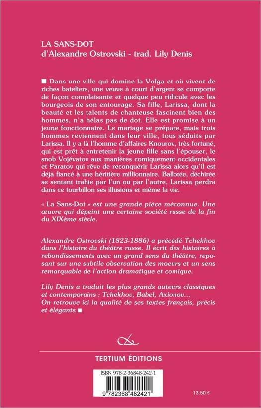 Dans une ville qui domine la Volga et où vivent de riches bateliers, une veuve à court d’argent se comporte de façon complaisante et quelque peu ridicule avec les bourgeois de son entourage. Sa fille, Larissa, dont la beauté et les talents de chanteuse fascinent bien des hommes, n’a hélas pas de dot. Elle est promise à un jeune fonctionnaire. Le mariage se prépare, mais trois hommes reviennent dans leur ville, tous séduits par Larissa. Il y a là l’homme d’affaires Knourov, très fortuné, qui est prêt à entretenir la jeune fille sans l’épouser, le snob Vojévatov aux manières comiquement occidentales et Paratov qui rêve de reconquérir Larissa alors qu’il est déjà fiancé à une héritière millionnaire. Ballotée, déchirée se sentant trahie par l’un ou par l’autre, Larissa perdra dans ce tourbillon ses illusions et même la vie. « La Sans-Dot » est une grande pièce méconnue. Une oeuvre qui dépeint une certaine société russe de la fin du XIXème siècle. Alexandre Ostrovski (1823-1886) a précédé Tchekhov dans l’histoire du théâtre russe. Il écrit des histoires à rebondissements avec un grand sens du théâtre, reposant sur une subtile observation des moeurs et un sens remarquable de l’action dramatique et comique.