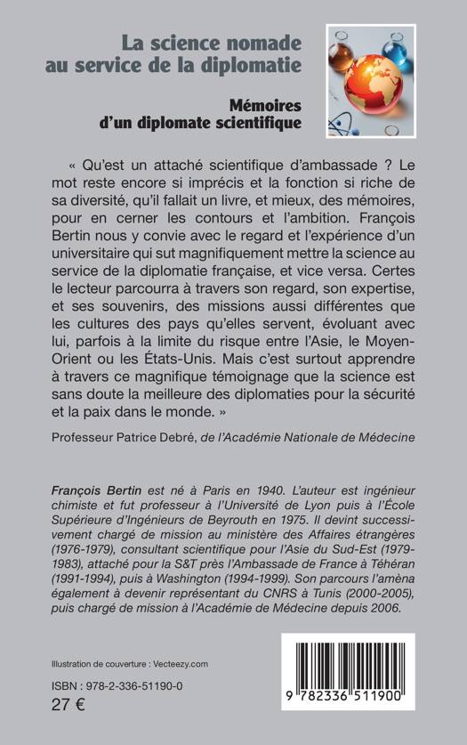 Qu'est un attaché scientifique d'ambassade ? Le mot reste encore si imprécis et la fonction si riche de sa diversité, qu'il fallait un livre, et mieux, des mémoires, pour en cerner les contours et l'ambition. François Bertin nous y convie avec le regard et l'expérience d'un universitaire qui sut magnifiquement mettre la science au service de la diplomatie française, et vice versa. Certes le lecteur parcourra à travers son regard, son expertise, et ses souvenirs, des missions aussi différentes que les cultures des pays qu'elles servent, évoluant avec lui, parfois à la limite du risque entre l'Asie, le Moyen-Orient ou les États-Unis. Mais c'est surtout apprendre à travers ce magnifique témoignage que la science est sans doute la meilleure des diplomaties pour la sécurité et la paix dans le monde. Professeur Patrice Debré, de l'Académie Nationale de Médecine