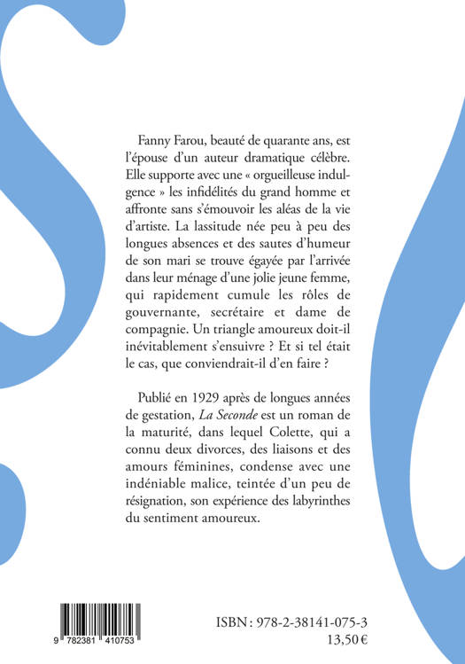 Publié en 1929 après de longues années de gestation, La Seconde est un roman de la maturité, dans lequel Colette, qui a connu deux divorces, des liaisons et des amours féminines, condense avec une indéniable malice, teintée d’un peu de résignation, son expérience des labyrinthes du sentiment amoureux.