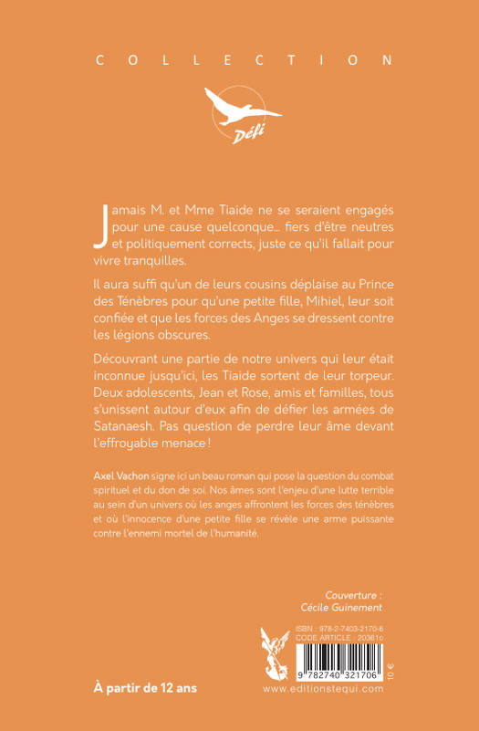 Il ne serait jamais venu à l'idée de monsieur et madame Tiaide de s'engager pour une cause quelconque. Ils étaient fiers d'être neutres et politiquement corrects, juste ce qu'il fallait pour vivre tranquilles... jusqu'à ce qu'un de leurs cousins déplaise au prince des Ténèbres, jusqu'à l'arrivée chez eux d'une petite fille, Mihiel, dont l'existence allait tout changer. Les forces des Anges se dressèrent alors contre les légions des Ténèbres tandis que de nouveaux amis se révélaient à l'occasion d'un voyage en Normandie, que des ennemis insoupçonnés les attaquaient, que des alliés inattendus surgissaient, que des enfants et adolescents se mobilisaient avec leurs parents face aux puissances du Mal. Les Tiaide sortirent de leur torpeur et découvrirent un univers inconnu. La rencontre de Jean, de Rose et de leurs amis les éveillèrent à l'attention aux autres, mais pour que la vraie nature de chacun refasse surface, il fallait défier les armées obscures ! Afin de ne pas perdre leur âme devant l'effroyable menace, ils allaient devoir tous ensemble affronter Satanaël. Un roman plein de suspense, à la fois drôle et profond, qui nous révèle l'intensité du combat spirituel à l'oeuvre autour de nous et dans nos vies. A propos de l'auteur : Axel Vachon, à qui l'on doit dans la collection « Défi » la trilogie des « 50e hurlants », « Les colons de Nouvelle-France » 1 & 2, « Les Paladins de Mongré » et « Chantécume », marié et père de six enfants, nous initie à un aspect fantastique du monde terrestre qui est le nôtre, où l'innocence d'une petite créature se révèle en définitive une arme puissante contre le plus grand ennemi de l'humanité.