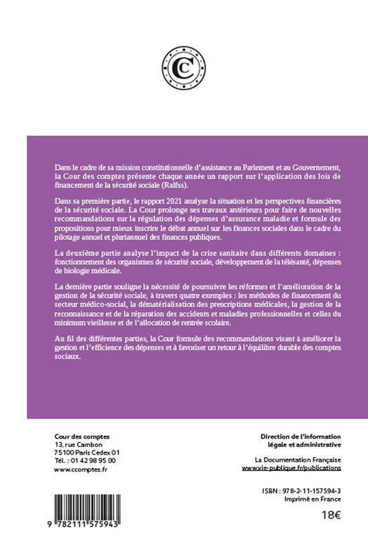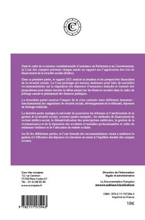 Dans sa première partie, le rapport 2021 présente la situation et les perspectives financières de la sécurité sociale. La deuxième partie analyse l’impact de la crise sanitaire dans différents domaines : fonctionnement des organismes de sécurité sociale, développement de la télésanté, dépenses de biologie médicale. La dernière partie souligne la nécessité de poursuivre les réformes et l’amélioration de la gestion de la sécurité sociale, à travers quatre exemples : les méthodes de financement du secteur médico-social, la dématérialisation des prescriptions médicales, la gestion de la reconnaissance et de la réparation des accidents et maladies professionnelles et celles du minimum vieillesse et de l’allocation de rentrée scolaire.