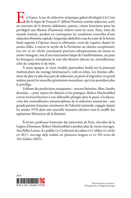 Une reflexion sur le concept de seduction dans la societe francaise, depuis la galanterie developpee a la cour royale de Francois Ier jusqu'aux revendications feministes d'egalite entre les sexes. Apparentee a la virilite ou a la politesse, cette notion evolue en meme temps que l'image de la femme, passant de l'epouse chaste a la dangereuse seductrice en passant par la seduisante Parisienne.