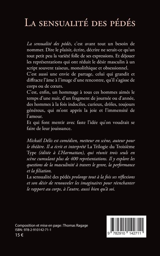 La sensualité des pédés, c'est avant tout un besoin de nommer. Dire le plaisir, écrire, décrire ne serait-ce qu'un tout petit peu la variété folle de ses expressions. Et déjouer les représentations qui ont réduit le désir masculin à un script souvent taiseux, monolithique et obsessionnel. C'est aussi une envie de partage, celui qui grandit et diffracte l'âme à l'image d'une rencontre, qu'il s'agisse de corps ou de coeurs. C'est, enfin, un hommage à tous ces hommes aimés le temps d'une nuit, d'un fragment de journée ou d'année, des hommes à la fois indociles, curieux, drôles, toujours généreux, qui m'ont appris la joie et l'immensité de l'amour, Et qui font mentir avec faste l'idée qu'on voudrait se faire de leur jouissance.