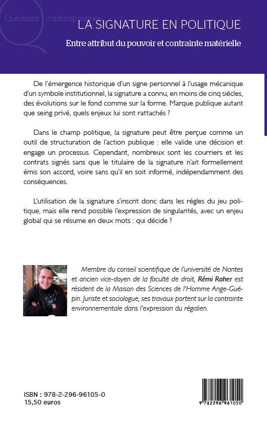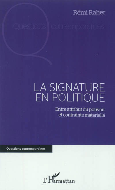 Dans le champ politique, la signature peut être perçue comme un outil de structuration de l'action publique : elle valide une décision et engage un processus. Cependant, nombreux sont les documents signés sans que le titulaire de la signature n'ait formellement émis son accord, voire sans qu'il en soit informé. L'utilisation de la signature s'inscrit dans les règles du jeu politique, mais elle rend possible l'expression de singularités, avec un enjeu global qui se résume ainsi : qui décide ?