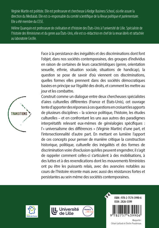 Face à la persistance des inégalités et des discriminations dont font l’objet, dans nos sociétés contemporaines, des groupes d’individus en raison de certaines de leurs caractéristiques (genre, orientation sexuelle, ethnie, situation sociale, situations de handicap), la question se pose de savoir d’où viennent ces discriminations, quelles formes elles prennent dans des sociétés démocratiques basées en principe sur l’égalité des droits, et comment les mettre au jour et les combattre. Construit comme un dialogue entre deux chercheuses spécialistes d’aires culturelles différentes (France et États-Unis), cet ouvrage tente d’apporter des réponses à ces questions en croisant les apports de plusieurs disciplines – la science politique, l’histoire, les études culturelles – et en confrontant les uns aux autres des paradigmes interprétatifs relevant eux-mêmes de généalogies spécifiques : l’« universalisme des différences » (Virginie Martin) d’une part, et l’intersectionnalité d’autre part. En mettant en lumière l’apport de ces concepts pour penser de manière critique la construction historique, politique, culturelle des inégalités et des formes de discrimination voire d’exclusion qu’elles peuvent engendrer, il s’agit de rappeler comment celles-ci s’articulent à des mobilisations, à des luttes et à des revendications dont les mouvements féministes ont pu être les puissants relais, avec des avancées notables au cours de l’histoire récente mais avec aussi des résistances fortes et persistantes au sein même des sociétés contemporaines.
