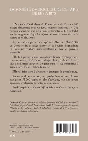 L’Académie d’agriculture de France vient de fêter ses 260 ans sous un idéal toujours maintenu : « Une passion, connaître, une ambition, transmettre ». Elle réfléchit sur les progrès, explique les enjeux de tous ordres et éclaire la société et les décideurs. Avec ce volume portant sur la période allant de 1816 à 1870, on découvre les activités d’alors de la Société d’agriculture de Paris, aux relations assez satisfaisantes avec les pouvoirs successifs. Elle fait preuve d’une importante liberté d’entreprendre, traitant certes principalement d’agriculture, mais de plus en plus d’industries agricoles, de génie rural et elle commence à s’intéresser à l’alimentation humaine. Elle sait faire appel à des savants étrangers de premier rang. Au cours de ces années, ses productions écrites directes atteignent 55 000 pages et elle s’applique, via des revues agricoles, à vulgariser davantage ses résultats. En fin de période, elle est déjà en fait, si ce n’est en droit, une Académie.