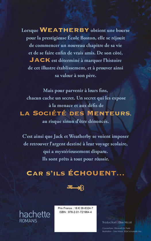 Weatherby ne s’est jamais vraiment sentie à sa place nulle part. Lorsqu’elle obtient une bourse pour la prestigieuse École Boston, elle se réjouit d’entrer dans le monde de son père, qu’elle n’a jamais connu, et de se faire enfin de vrais amis. Sauf que la jeune fille cache un secret qu’elle doit à tout prix protéger. Tous les membres de la riche et influente famille de Jack ont marqué l’histoire de l’École Boston. Tous, sauf Jack, qui ne parvient pas à se montrer à la hauteur. S’il est déterminé à prouver sa valeur à son père, Jack cache lui aussi un secret qui pourrait tout faire basculer. Lorsque l’argent destiné à leur voyage scolaire sur une île privée est volé, Jack et Weatherby sont invités à participer à un jeu à hauts risques pour élucider ce mystère. S’ils gagnent, ils seront choisis pour rejoindre la plus ancienne et la plus puissante société secrète du monde, et deviendront à jamais l’élite de l’École Boston. Ils n’auront plus jamais besoin de cacher leurs secrets respectifs. S’ils perdent…