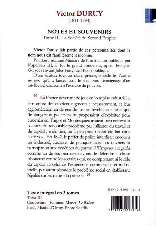 «La France devenant de jour en jour plus industrielle, le nombre des ouvriers augmentait incessamment, et leur agglomération en de grandes usines révélait leur force que de dangereux politiciens se proposaient d'exploiter pour eux-mêmes. Turgot et Montesquieu avaient bien entrevu la solution du redoutable problème par l'alliance du travail et du capital; mais rien, ou à peu près, n'avait été fait dans cette voie. En 1842, le préfet de police interdisait encore à un industriel, Leclaire, de pratiquer avec ses ouvriers la participation aux bénéfices du patron. L'Empereur regarda comme un de ses premiers devoirs de défendre la classe laborieuse contre les sectaires qui, ne comprenant ni le rôle du capital, ni celui de l'expérience commerciale et industrielle, pensaient résoudre le problème social en établissant l'égalité sur les ruines du patronat.»