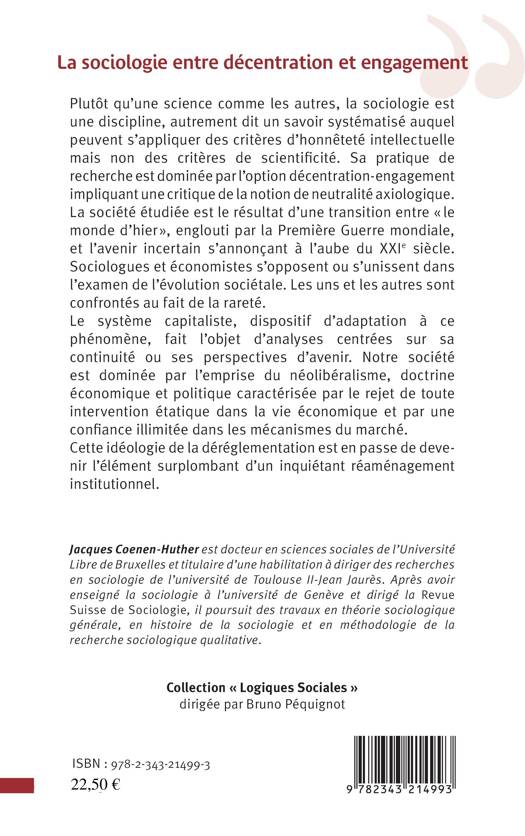 Plutôt qu'une science comme les autres, la sociologie est une discipline, autrement dit un savoir systématisé auquel peuvent s'appliquer des critères d'honnêteté intellectuelle mais non des critères de scientifi cité. Sa pratique de recherche est dominée par l'option décentration-engagement impliquant une critique de la notion de neutralité axiologique. La société étudiée est le résultat d'une transition entre « le monde d'hier », englouti par la Première Guerre mondiale, et l'avenir incertain s'annonçant à l'aube du XXIe siècle.Sociologues et économistes s'opposent ou s'unissent dans l'examen de l'évolution sociétale. Les uns et les autres sont confrontés au fait de la rareté.