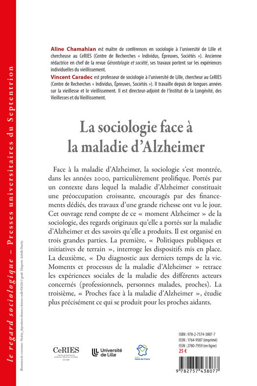 Face à la maladie d'Alzheimer, la sociologie s'est montrée, dans les années 2000, particulièrement prolifique. Portés par un contexte dans lequel la maladie d'Alzheimer constituait une préoccupation croissante, encouragés par des financements dédiés, des travaux d'une grande richesse ont vu le jour. Cet ouvrage rend compte de ce « moment Alzheimer » de la sociologie, des regards originaux qu'elle a portés sur la maladie d'Alzheimer et des savoirs qu'elle a produits. Il est organisé en trois grandes parties. La première, « Politiques publiques et initiatives de terrain », interroge les dispositifs mis en place. La deuxième, « Du diagnostic aux derniers temps de la vie. Moments et processus de la maladie d'Alzheimer » retrace les expériences sociales de la maladie des différents acteurs concernés (professionnels, personnes malades, proches). La troisième, « Proches face à la maladie d'Alzheimer », étudie plus précisément ce qui se produit pour les proches aidants.