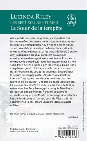 La Sœur de la tempête est le deuxième tome de la série événement Les Sept Sœurs, qui a conquis 20 millions de lecteurs dans le monde entier. À travers ces romans au souffle unique, peuplés de personnages inoubliables, liés par les drames et l’amour, Lucinda Riley a affirmé son immense talent, créant un nouveau genre littéraire à part entière.