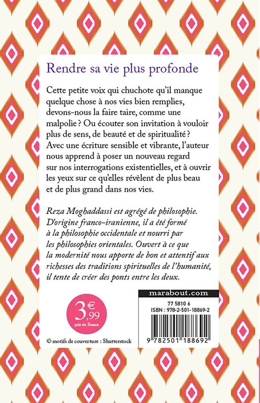 Cette petite voix qui chuchote qu'il manque quelque chose à nos vies bien remplies, devons-nous la faire taire, comme une malpolie ? Ou écouter son invitation à vouloir plus de sens, de beauté et de spiritualité ? Les chercheurs d'essentiel sont des sages déguisés en fous. Reza Moghaddassi invite le lecteur à entrer dans son univers, où la philosophie occidentale côtoie la spiritualité persane et nous ouvre à l'essentiel : « Tout être humain a besoin d'eau pour vivre et grandir. Ainsi en est-il de l'homme qui naît assoiffé. Mais à côté de sa soif physique, qui demande à être étanchée, il souffre d'une soif intérieure qui demande à être entretenue. Avec une écriture sensible et vibrante, Reza Moghaddassi incite à poser un nouveau regard sur nos interrogations existentielles, et à ouvrir les yeux sur ce qu'elles révèlent de plus beau et de plus grand dans nos vies.
