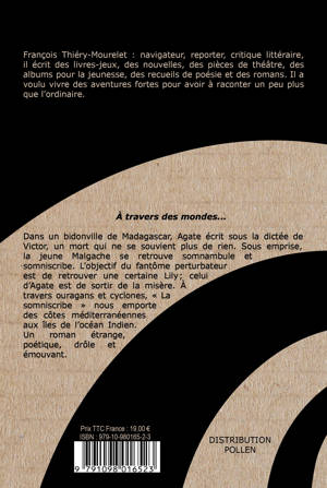 Dans un bidonville de Madagascar, Agate écrit sous la dictée de Victor, un mort qui ne se souvient plus de rien. Sous emprise, la jeune Malgache se retrouve somnambule et somniscribe. L’objectif du fantôme perturbateur est de retrouver une certaine Lily , celui d’Agate est de sortir de la misère. À travers ouragans et cyclones, « La somniscribe » nous emporte des côtes méditerranéennes aux îles de l’océan Indien. Un roman étrange, poétique, drôle et émouvant.