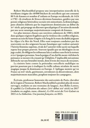 Robert Muchembled propose une interprétation nouvelle de la terrifiante énigme des 40 000 bûchers de sorcellerie qui ont consumé 80 % de femmes et nombre d’enfants en Europe occidentale, de 1424 à 1782 : ils résultent de féroces décisions humaines, guidées par une pensée religieuse hétérodoxe sectaire très minoritaire, la démonologie, pure chimère élaborée par les inquisiteurs dominicains au début du XVe siècle, qui propage un discours apocalyptique d’invasion du monde par une secte satanique majoritairement composée de femmes.