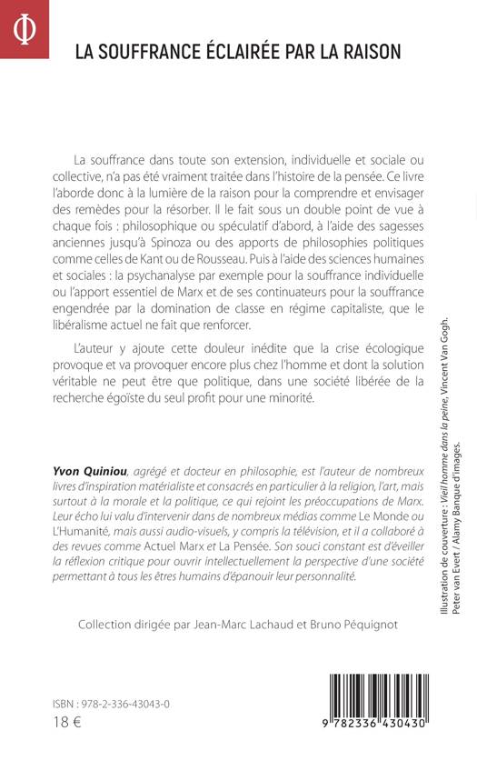 La souffrance - dans toute son extension, individuelle ou collective -, n'a pas été vraiment traitée dans l'histoire de la pensée. Cet essai l'aborde donc à la lumière de la raison, à la fois pour la comprendre et envisager des remèdes pour la résorber. Il le fait sous un double point de vue philosophique ou spéculatif d'abord, à l'aide des sagesses anciennes jusqu'à Spinoza ou des philosophies politiques de Kant ou de Rousseau. Puis à l'aide des sciences humaines et sociales la psychanalyse par exemple pour la souffrance individuelle, ou l'apport essentiel de Marx et de ses continuateurs pour la souffrance engendrée par la domination de classe en régime capitaliste, que le libéralisme actuel ne fait que renforcer. L'auteur y ajoute cette douleur inédite provoquée et aggravée par la crise écologique, dont la solution véritable ne peut être que politique, dans une société libérée de la recherche égoïste du profit.