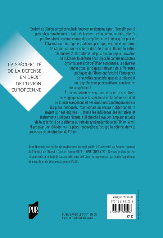 En droit de l’Union européenne, la défense est un domaine à part. Tremplin avorté puis tabou durable dans le cadre de la construction communautaire, elle n’a pu être admise comme champ de compétence de l’Union qu’au prix de l’élaboration d’un régime juridique spécifique, vecteur d’une forme de stigmatisation au sein du droit de l’Union. Depuis le milieu des années 2010 toutefois, et plus encore depuis l’invasion de l’Ukraine, la défense s’est imposée comme un secteur dynamique en droit de l’Union européenne. Les diverses innovations juridiques relevant de différentes politiques de l’Union ont favorisé l’émergence de nouvelles caractéristiques de la défense et une appréhension plus positive ou constructive de sa spécificité. À travers l’étude de ses marqueurs et de ses effets, l’ouvrage questionne la spécificité de la défense en droit de l’Union européenne et ses évolutions contemporaines sur les plans notionnels, fonctionnels ou encore institutionnels. Il revient sur ses origines ; il étudie les influences des initiatives et instruments juridiques récents, et il cherche à évaluer l’ampleur actuelle de la spécificité de la défense au sein du système juridique de l’Union. Ainsi, il propose une réflexion sur la place renouvelée qu’occupe la défense dans le processus de construction de l’Union.
