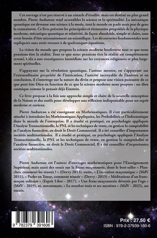 A portée de tous, Pierre Audureau rend accessible la Science et la Spiritualité. S’appuyant sur la révolution quantique, l’auteur s’interroge sur la nature du divin et propose une vision puissante de ce que peut être Dieu en fonction de ce que la science moderne nous propose. Une culture et une réflexion indispensables pour un esprit moderne et curieux.<br /> En effet, La mécanique quantique est devenue une science à la mode, tout le monde en parle mais peu de gens la connaissent. Ce livre présente les principales et étonnantes propriétés de la physique moderne, mécanique quantique et relativité, de façon abordable, simple et claire, sans avoir besoin d’être nécessairement un scientifique. La vision du monde que propose la science moderne bouleverse tout ce que nous pensions être la réalité. Cela a une conséquence immédiate sur les croyances religieuses et plus largement spirituelles.<br /> Fort de son approche précieuse, Pierre Audureau a rédigé un livre qui propose une initiation, simple à comprendre, aux principes de la physique quantique et de la relativité, sans avoir besoin de connaissances scientifiques préalables. Simultanément, il invite à une réflexion globale sur la spiritualité et sa cohabitation parfois douloureuse avec la pensée rationnelle et scientifique. Une conjonction de la recherche spirituelle avec la vision la plus moderne de la Nature grâce à la physique moderne. L’ouvrage reprend un tableau synoptique et chronologique de l’évolution de la spiritualité, de la philosophie et des sciences (quatrième partie) au cours des âges, de l’Antiquité à nos jours. L’auteur suggère une relation simple et claire entre lui et le lecteur. Cet ouvrage est majeur. <br /> Pierre Audureau a débuté sa carrière comme Instituteur. Il devint Normalien, puis Agrégé de Mathématiques. Enseignant dans l’Enseignement Supérieur, il s’est particulièrement attaché à introduire les Mathématiques Appliquées, les Probabilités et l’Informatique dans le monde de l’entreprise. Il a étudié et pratiqué, en psychologie appliquée l’Analyse Transactionnelle, la PNL et les techniques de vente, en gestion la comptabilité et l’analyse financière, en droit le Droit Commercial. Il a été conseiller d’importantes sociétés multinationales. Il a étudié et pratiqué, en psychologie appliquée l’Analyse Transactionnelle, la PNL et les techniques de vente, en gestion la comptabilité et l’analyse financière, en droit le Droit Commercial. Il a été conseiller d’importantes sociétés multinationales.<br /> Pierre Audureau est l’auteur d’ouvrages mathématiques pour l’Enseignement Supérieur, mais aussi des essais sur la Franc-maçonnerie, dont le best-seller «Planches, comment les réussir?» (Dervy 2013), outre, «L’initiation maçonnique» (MdV 2011), Parler en Tenue, comment réussir (Dervy - 2015) «Méditations d’un franc-maçon solitaire» (Esprit Libre - 2017), Une franc-maçonnerie dévoyée par l’ego (MdV - 2019), et, notamment, «Le nombre trois et ses mystères (MdV - 2023), un succès. Il publie une cerise sur un gâteau, avec «Spiritualité et Science moderne, mécanique quantique et relativité. La Science et la Spiritualité pour les presque nuls» (Ed Code9 - Paris)