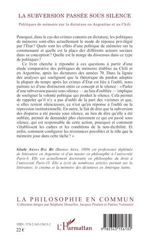 Pourquoi, dans le cas des crimes commis en dictature, les politiques de mémoire sont-elles actuellement le mode de réponse privilégié par l'État ? Quels sont les effets d'une politique de mémoire sur la communauté et quelle est la place des différents acteurs sociaux dans sa conception ? Quelle est la marge du dissensus dans ce type de politiques ? Ce livre cherche à répondre à ces questions à partir d'une étude comparative des politiques de mémoire établies au Chili et en Argentine, après les dictatures des années 70.