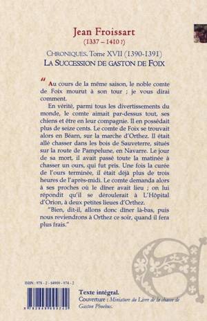 En vérité, parmi tous les divertissements du monde, le comte aimait par-dessus tout, ses chiens et être en leur compagnie. Il en possédait plus de seize cents. Le comte de Foix se trouvait alors en Béarn, sur la marche d'Orthez. Il était allé chasser dans les bois de Sauveterre, situés sur la route de Pampelune, en Navarre. Le jour de sa mort, il avait passé toute la matinée à chasser un ours, qui fut pris. Une fois la curée de l'ours terminée, il était déjà plus de trois heures de l'après-midi. Le comte demanda alors à ses proches où le dîner avait lieu ; on lui répondit qu'il se déroulerait à L'Hôpital d'Orion, à deux petites lieues d'Orthez.