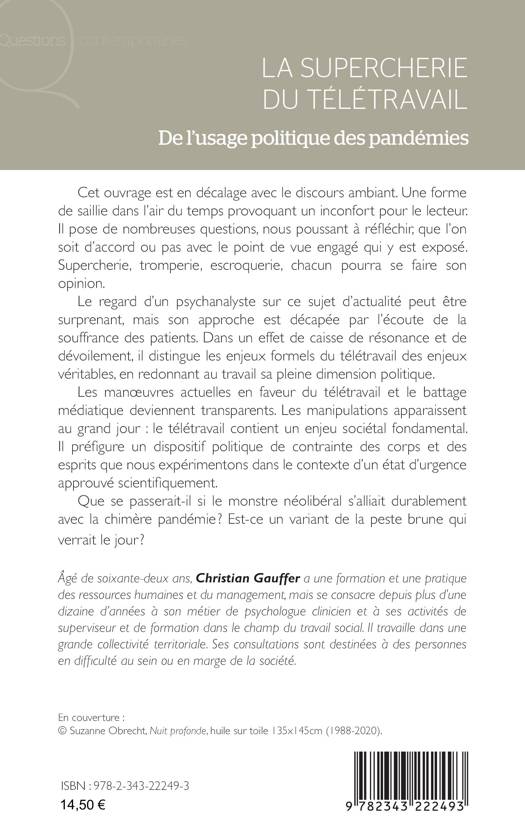 Cet ouvrage est en décalage avec le discours ambiant. Une forme de saillie dans l’air du temps provoquant un inconfort pour le lecteur. Il pose de nombreuses questions, nous poussant à réfléchir, que l’on soit d’accord ou pas avec le point de vue engagé qui y est exposé. Supercherie, tromperie, escroquerie, chacun pourra se faire son opinion. Le regard d’un psychanalyste sur ce sujet d’actualité peut être surprenant, mais son approche est décapée par l’écoute de la souffrance des patients. Dans un effet de caisse de résonance et de dévoilement, il distingue les enjeux formels du télétravail des enjeux véritables, en redonnant au travail sa pleine dimension politique.